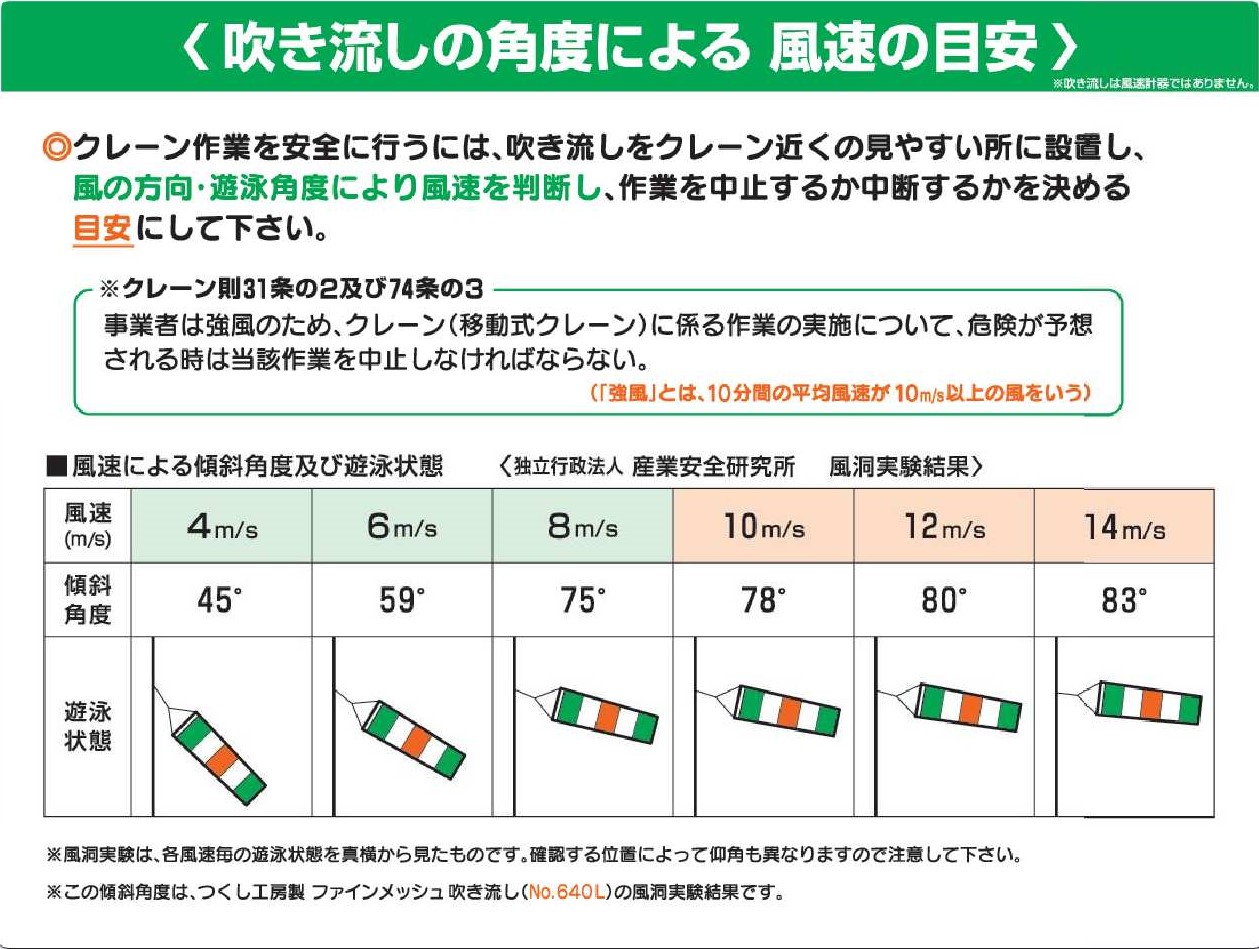 ファインメッシュ吹き流しは、風洞実験を行い、クレーン則尊守の目安となるよう角度を計測した商品です。