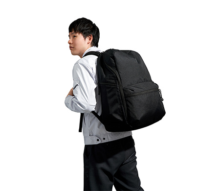 メインポケット下部には、安全靴の持ち運びに便利なシューズポーチを装備。高さにゆとりを持たせた設計で、ハイカットシューズも収納可能です。 さらに、背中側には13インチまでのPCを収納できる、ファスナー付きのPCポケットを装備。クッション性のある素材で電子機器の運搬も安心です。