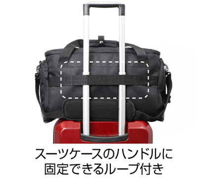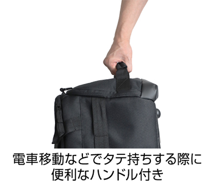 ・電車移動などでタテ持ちする際に便利なハンドル付き。